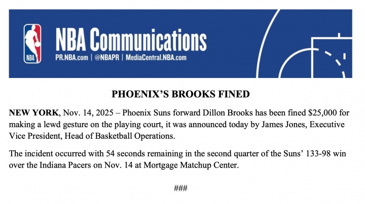 Hôm nay NBA đã chính thức thông báo rằng Dillon Brooks đã bị phạt 25.000 đô la vì có những hành động không đứng đắn trên sân.