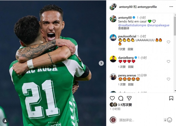 Anthony đã đăng bức ảnh ăn mừng bàn thắng của mình lên mạng xã hội sau trận đấu với dòng chữ: "Thật hạnh phúc khi giành chiến thắng trên sân nhà!"